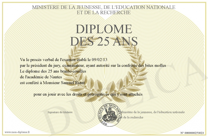 Envoyez par email votre Diplôme des 25 ans personalisé
