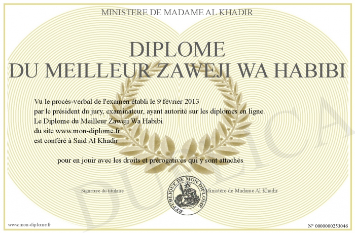 Envoyez par email votre Diplôme du Meilleur Zaweji Wa Habibi personalisé