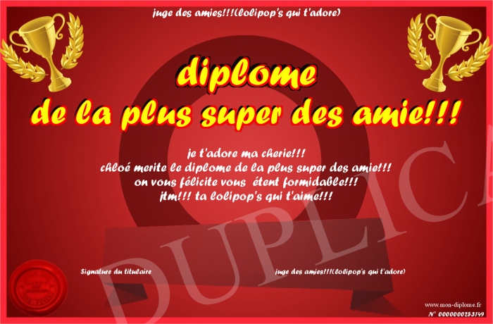 Envoyez par email votre diplome de la plus super des amie!!! personalisé