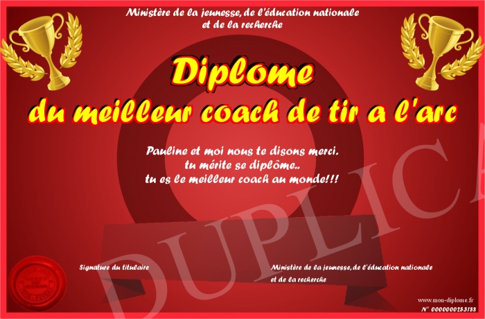 Envoyez par email votre Diplôme du meilleur coach de tir a l'arc personalisé