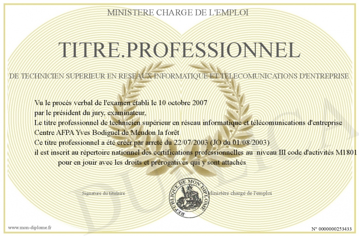 Envoyez par email votre TITRE.PROFESSIONNEL DE TECHNICIEN SUPERIEUR EN RESEAUX INFORMATIQUE ET TELECOMUNICATIONS D'ENTREPRISE personalisé