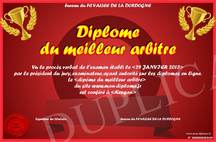 Envoyez par email votre Diplôme du meilleur arbitre personalisé