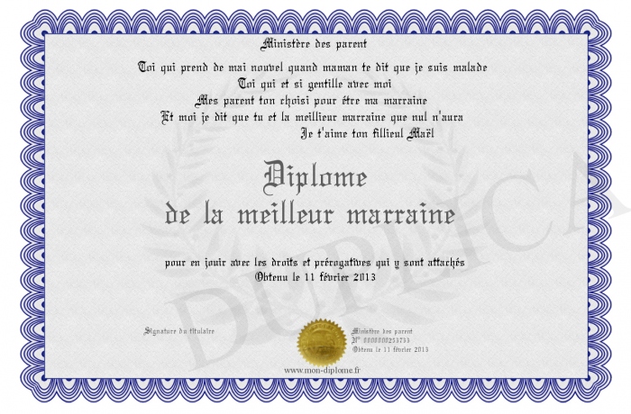 Envoyez par email votre Diplôme de la meilleur marraine personalisé
