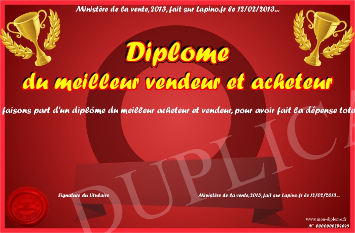 Envoyez par email votre Diplôme du meilleur vendeur et acheteur personalisé