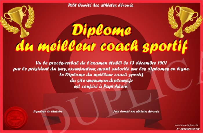 Envoyez par email votre Diplôme du meilleur coach sportif personalisé