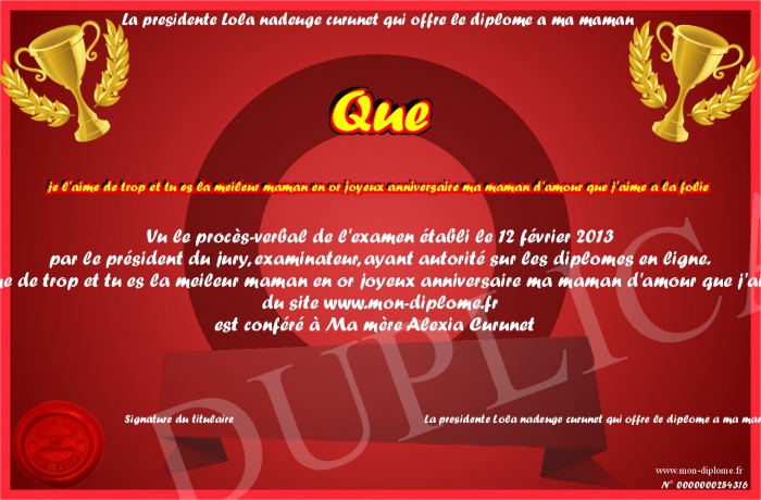 envoyé par le La presidente Lola nadeuge curunet qui offre le diplome a ma maman !