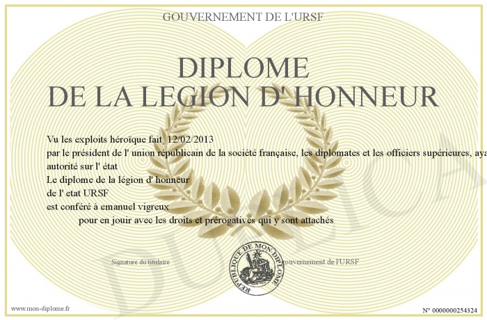 Envoyez par email votre diplôme de la légion d' honneur personalisé