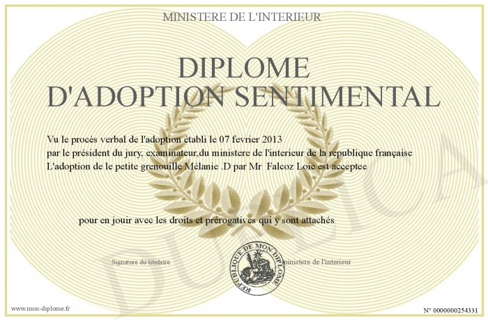 Envoyez par email votre Diplome d'adoption sentimental personalisé