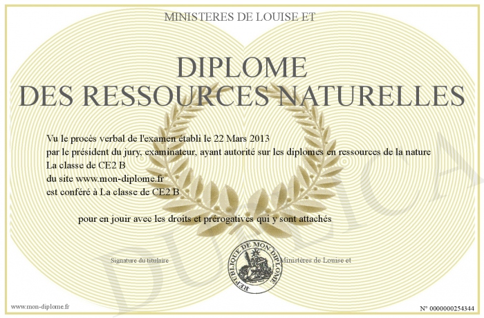 Envoyez par email votre Diplôme des Ressources Naturelles personalisé