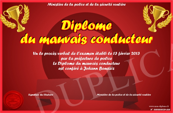 Envoyez par email votre Diplôme du mauvais conducteur personalisé