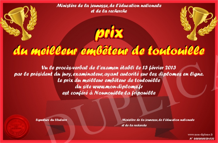 Envoyez par email votre prix du meilleur embêteur de toutouille personalisé