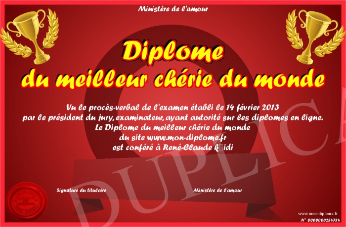 Envoyez par email votre Diplôme du meilleur chérie du monde personalisé