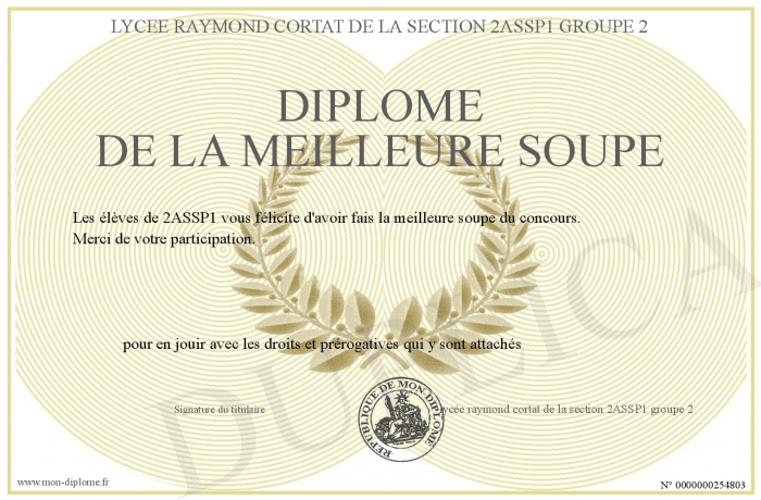 Envoyez par email votre diplôme de la meilleure soupe personalisé