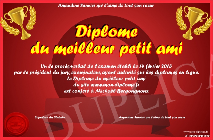 Envoyez par email votre Diplôme du meilleur petit ami personalisé