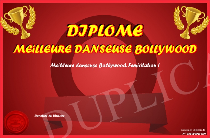 Envoyez par email votre DIPLOME MEiLLEURE DANSEUSE BOLLYWOOD personalisé