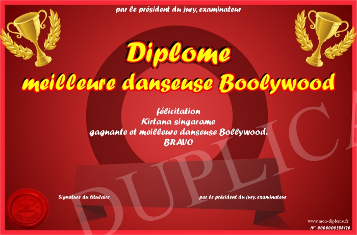 Envoyez par email votre Diplôme meilleure danseuse Boolywood personalisé