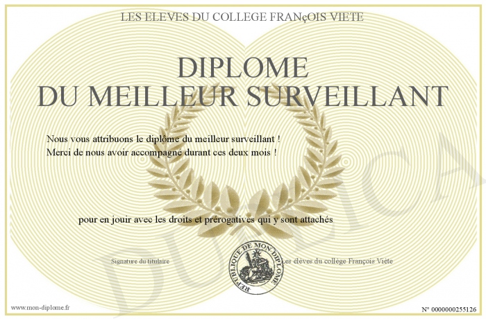 Envoyez par email votre Diplôme du meilleur surveillant personalisé