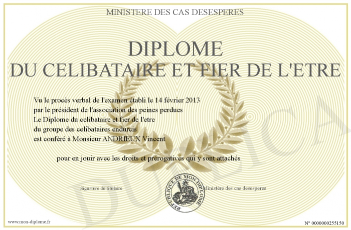 Envoyez par email votre Diplôme du celibataire et fier de l'etre personalisé