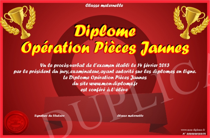 Envoyez par email votre Diplôme Opération Pièces Jaunes personalisé