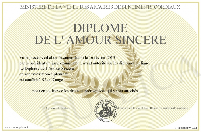 Envoyez par email votre Diplôme de l' Amour Sincère personalisé