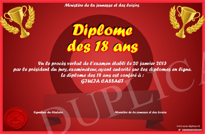 Envoyez par email votre Diplôme des 18 ans personalisé