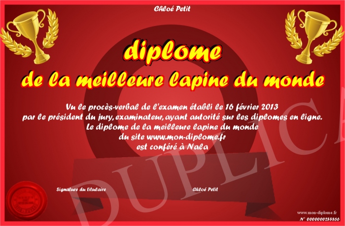 Envoyez par email votre diplome de la meilleure lapine du monde personalisé