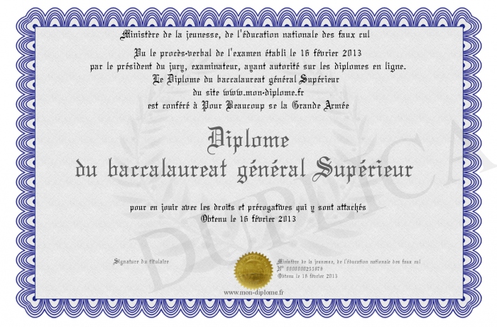 Envoyez par email votre Diplôme du baccalaureat général Supérieur personalisé