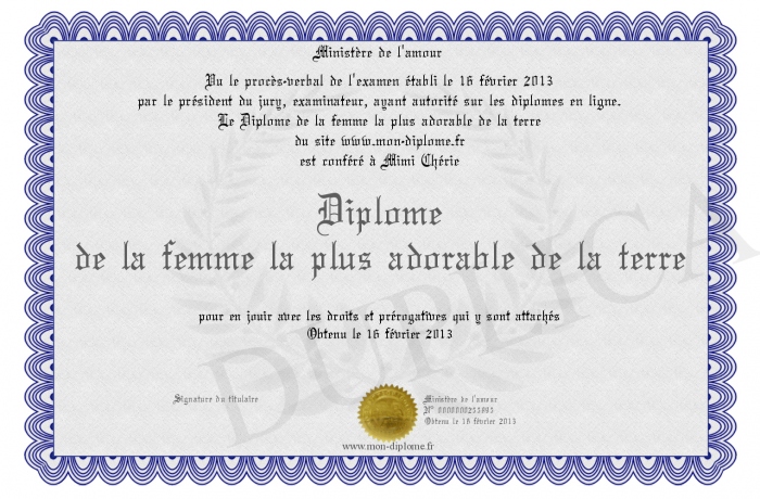 Envoyez par email votre Diplôme de la femme la plus adorable de la terre personalisé