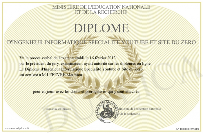 Envoyez par email votre Diplôme d'Ingénieur Informatique Spécialité Youtube et Site du Zero personalisé