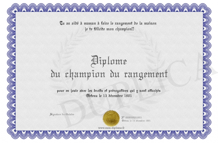 Envoyez par email votre Diplôme du champion du rangement personalisé