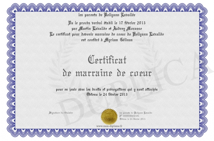 Envoyez par email votre Certificat de marraine de coeur personalisé