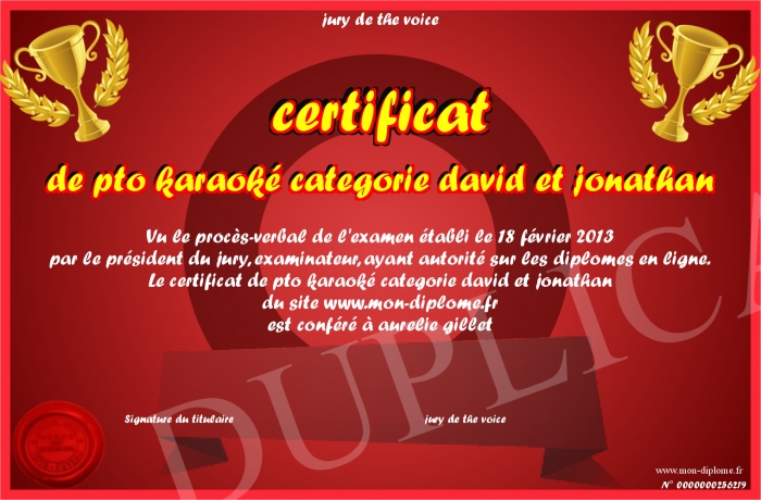Envoyez par email votre certificat de pto karaoké categorie david et jonathan personalisé