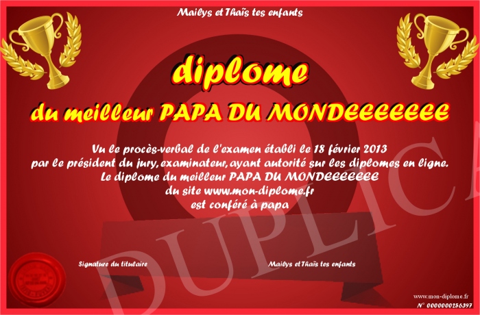 Envoyez par email votre diplôme du meilleur PAPA DU MONDEEEEEEE personalisé