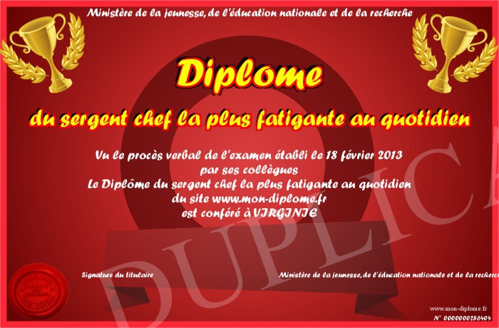 Envoyez par email votre Diplôme du sergent chef la plus fatigante au quotidien personalisé