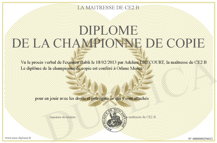 Envoyez par email votre Diplôme de la championne de copie personalisé