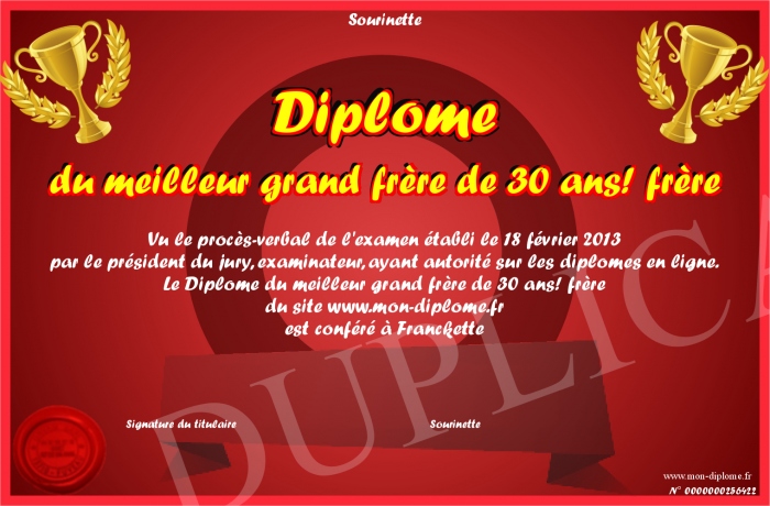 Envoyez par email votre Diplôme du meilleur grand frère de 30 ans! frère personalisé