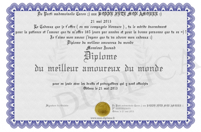 Envoyez par email votre Diplôme du meilleur amoureux du monde personalisé