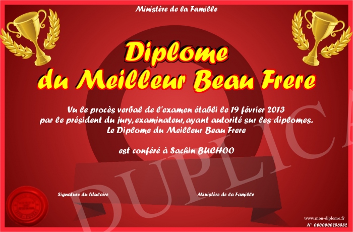 Envoyez par email votre Diplôme du Meilleur Beau Frere personalisé