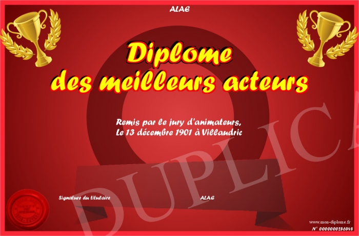 Envoyez par email votre Diplôme des meilleurs acteurs personalisé