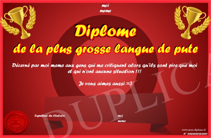 Envoyez par email votre Diplome de la plus grosse langue de pute personalisé