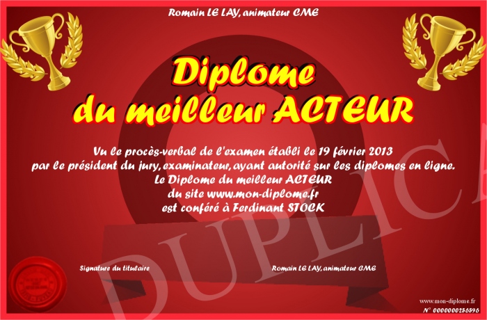 Envoyez par email votre Diplôme du meilleur ACTEUR personalisé