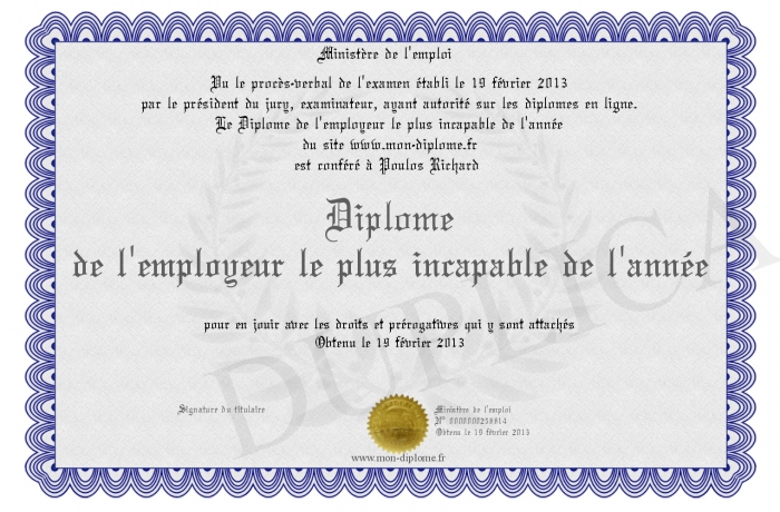 Envoyez par email votre Diplôme de l'employeur le plus incapable de l'année personalisé