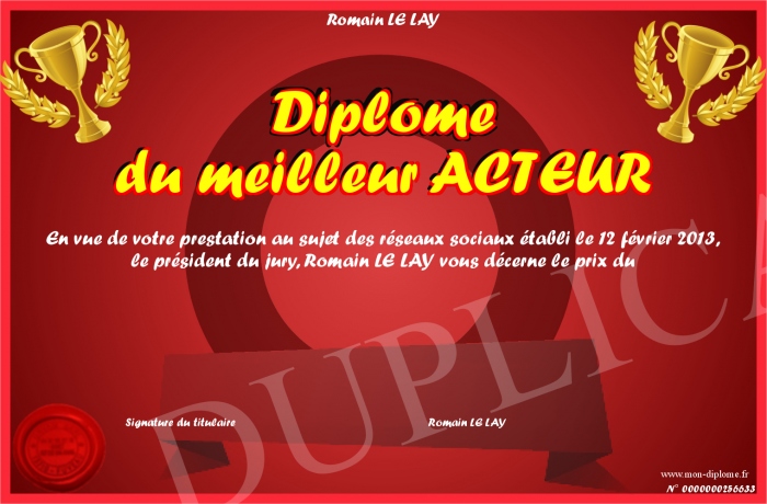 Envoyez par email votre Diplôme du meilleur ACTEUR personalisé