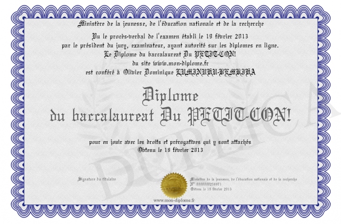 Envoyez par email votre Diplôme du baccalaureat Du PETIT-CON! personalisé