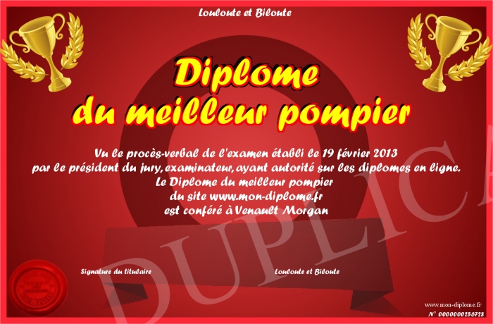 Envoyez par email votre Diplôme du meilleur pompier personalisé