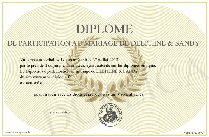 Envoyez par email votre Diplôme de participation au mariage de DELPHINE & SANDY personalisé