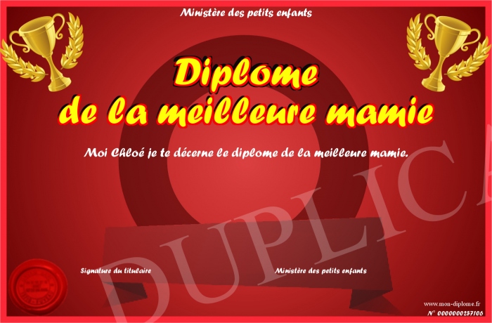 Envoyez par email votre Diplôme de la meilleure mamie personalisé