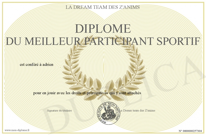 Envoyez par email votre Diplôme du meilleur participant sportif personalisé