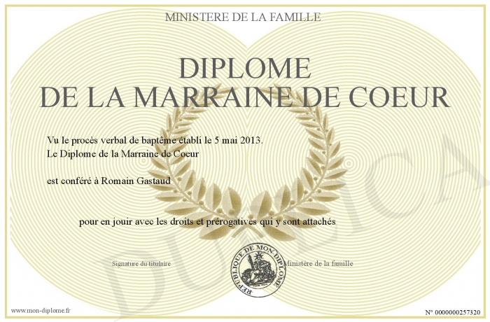 Envoyez par email votre Diplôme de la Marraine de Coeur personalisé