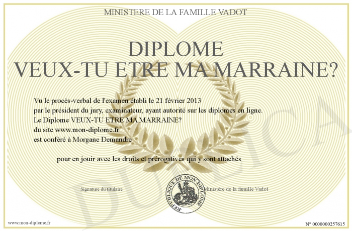 Envoyez par email votre Diplôme VEUX-TU ETRE MA MARRAINE? personalisé